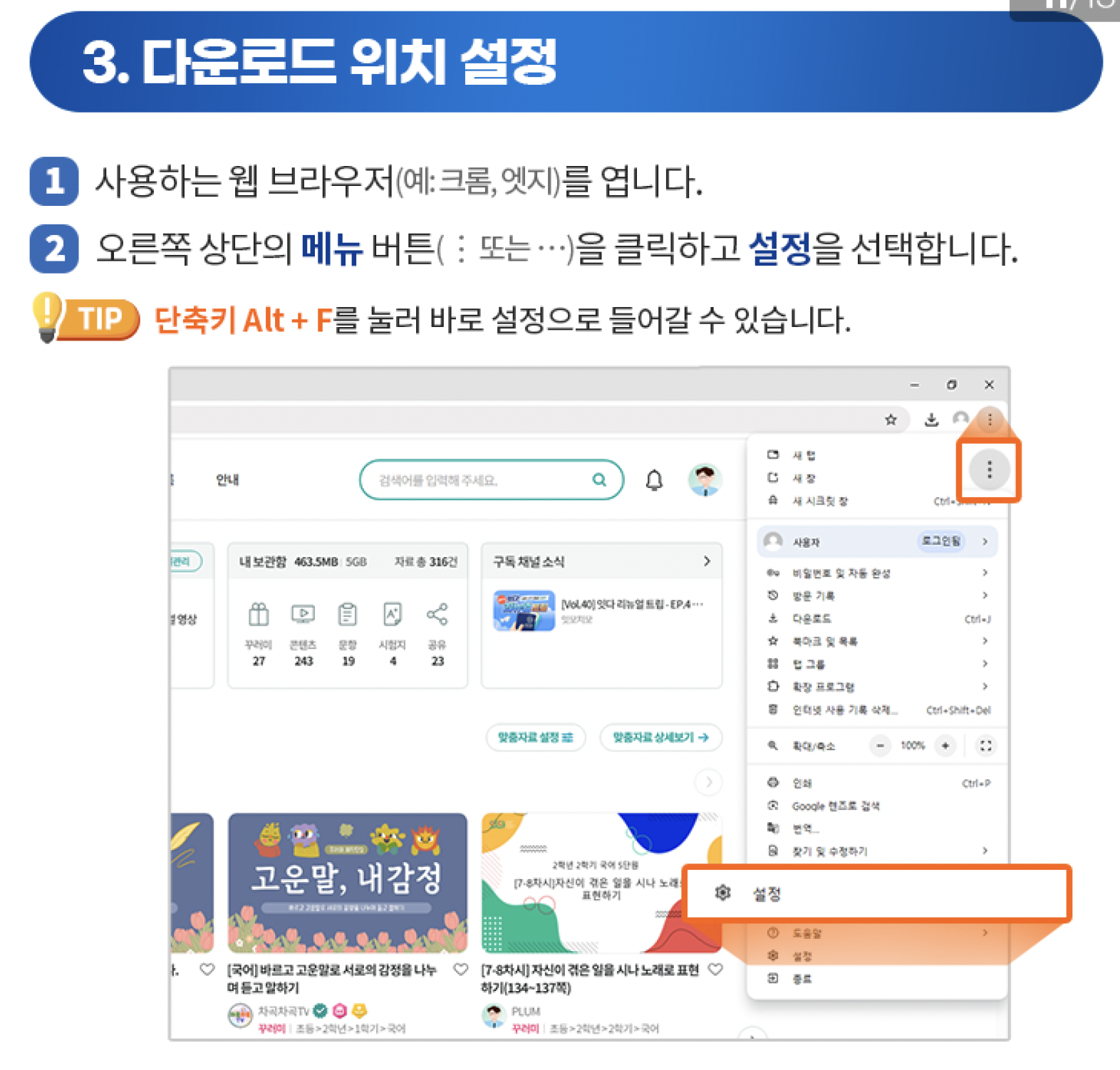 • 브라우저 설정(크롬 기준) → 메뉴(⋮) → 설정
